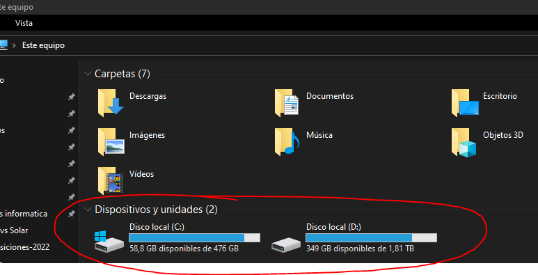 2. En la sección "Dispositivos y unidades" puedes ver tus discos duros y su espacio ocupado y disponible. Como ves, están organizados por letras.