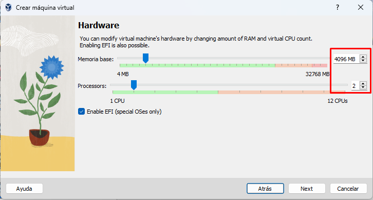 | 3. Asignamos recursos a la máquina (RAM y procesadores) |
