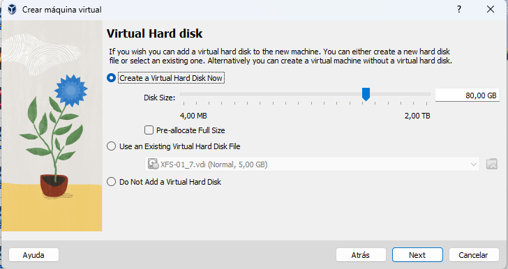 El checkbox de "Pre-allocate Full Size" (si se marca) hace que el espacio que indicamos se ocupe inmediatamente.