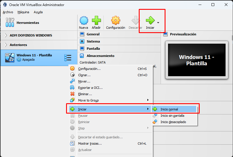 Para arrancar la máquina podemos hacerlo pulsando botón derecho en ella, pulsando "iniciar" en el menú superior o simplemente haciendo doble click sobre ella.