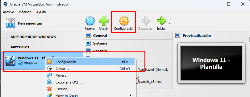 La mayor parte de las configuraciones de máquinas solo puede cambiarse si estas están apagadas (tenlo en cuenta). Esto es, no puedes ampliarle la RAM a la VM si está encendida.
